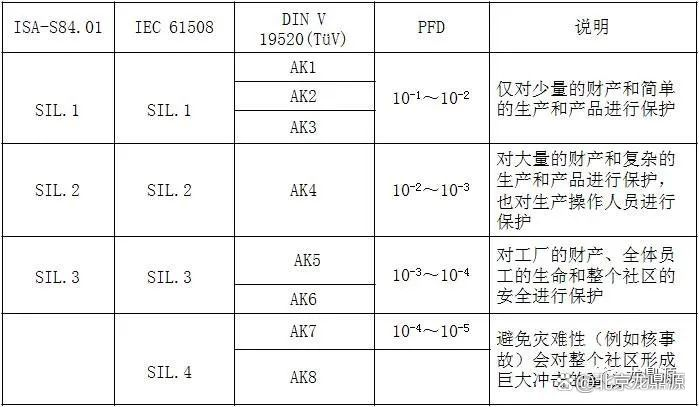 Selon la norme IEC, il est divisé en SIL1-SIL4 de bas à haut, Sil1-SIL3 d'Isa 84.01 et Ak1-AI8 de bas à haut selon DIN V VDE0804. La relation correspondante entre eux est la suivante.